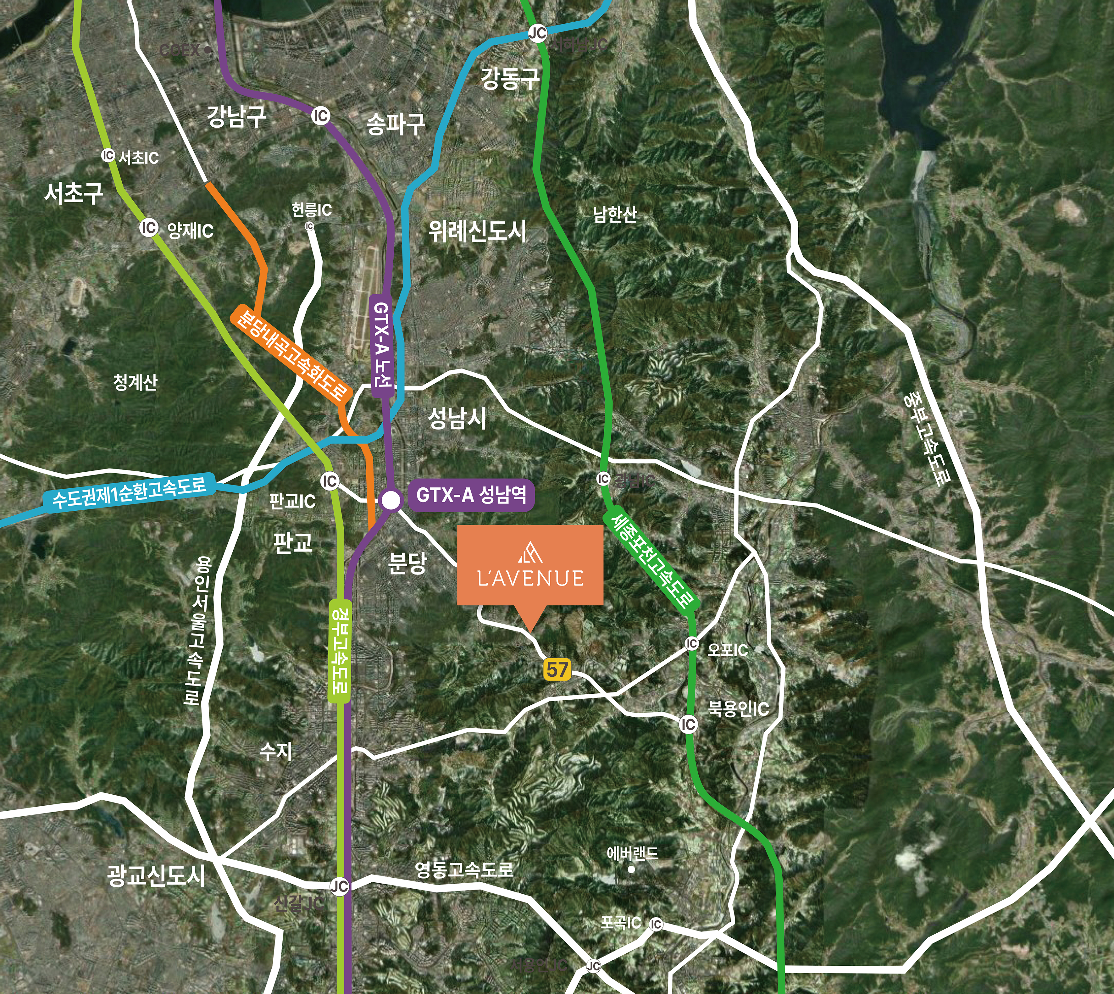 57호선 국도를 통해 주변 고속도로에 빠르게 진입할 수 있어 강남·세종·대전 등 주요 도시는 물론, 가까운 분당과 판교 생활권까지 손쉽게 연결됩니다.